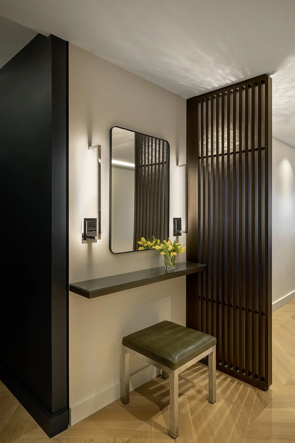 Sleek minimalist design with a combination of millwork finishes defining the space.